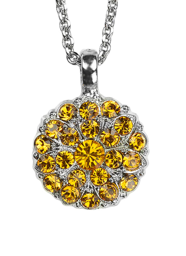 - Chain is approximately 15 inches long with a 4 inch extender. Pendant is approximately 1/2in wide. Rhodium plating over Nickel Free Brass.